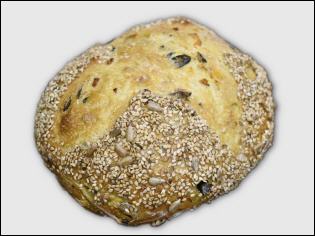 Brot aus Weizenmehl, Roggenmehl und Dinkelmehl. Mit Sesam und Sonnenblumenkerne.