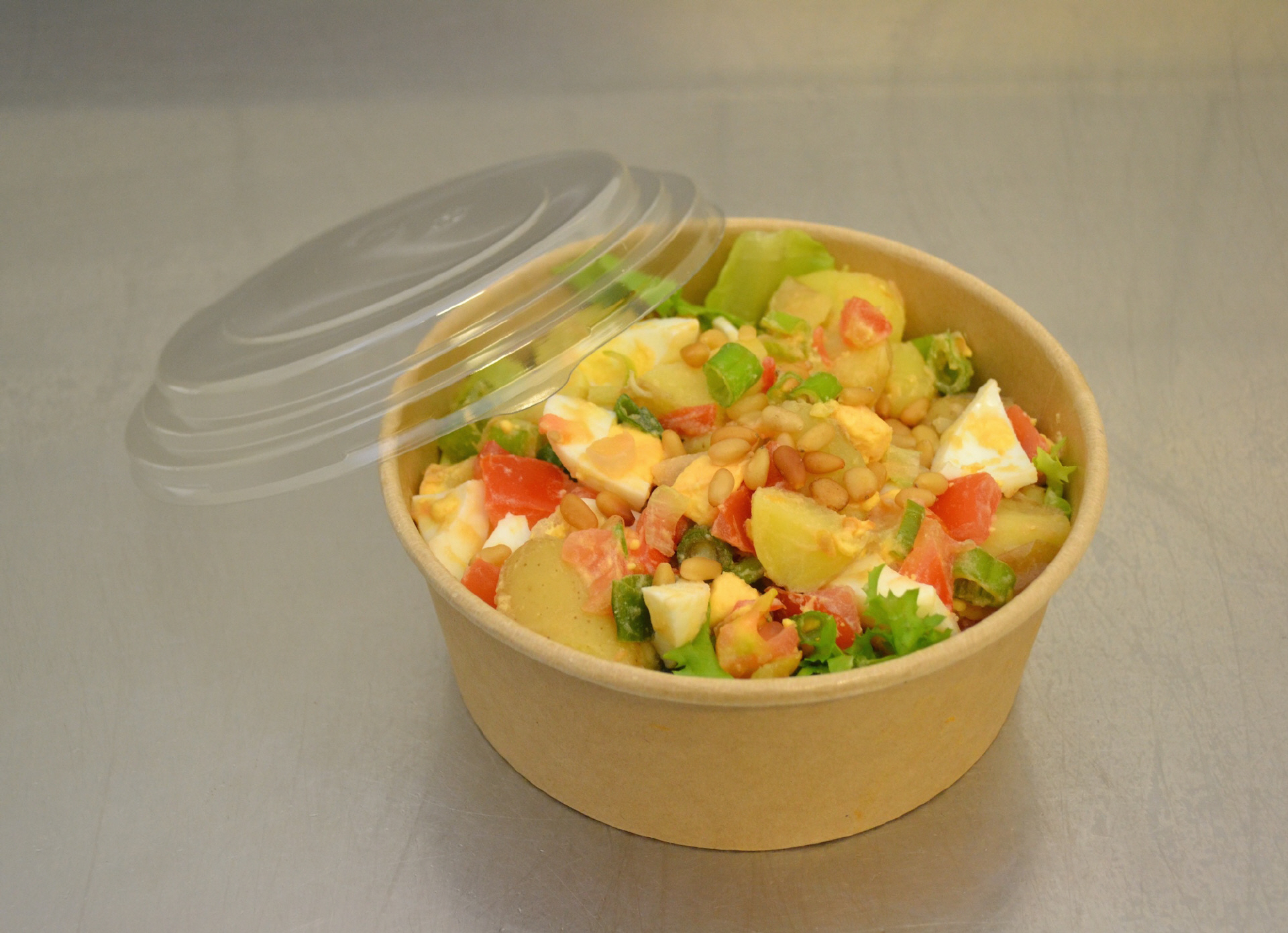 Frühkartoffeln mit Lauchzwiebeln,Tomaten, Eier, Blattsalat und gerösteten Pinienkernen |